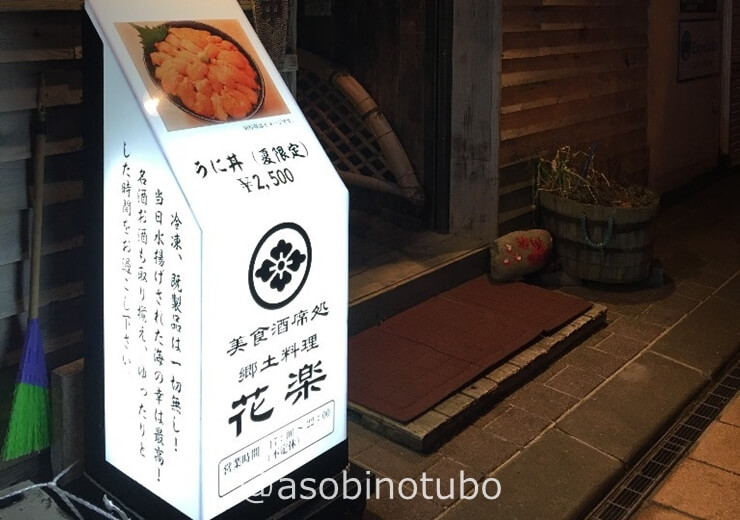 稚内2日目の夜は街をふらふらと歩いてお店を探しました。郷土料理、花楽さんです。なになに夏限定のうに丼2500円。「冷凍、既製品は一切なし、当日水揚げされた海の幸は最高!」これは引き付けられますね。