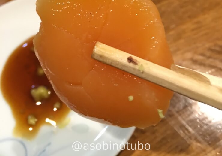 メニューやオススメを見ると女将のこだわりが盛りだくさんです。最初にお願いしたのは、1000個に1個しか採れないという赤い帆立です。ある時はあるけど無い時は無いという代物。赤いから縁起物だそうです。
