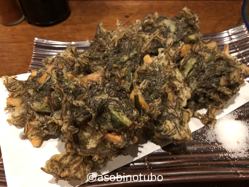 「もずく天ぷら」を最後に注文。野菜も混ざって「もずくかき揚げ」みたいになっていてとても口に合いました。