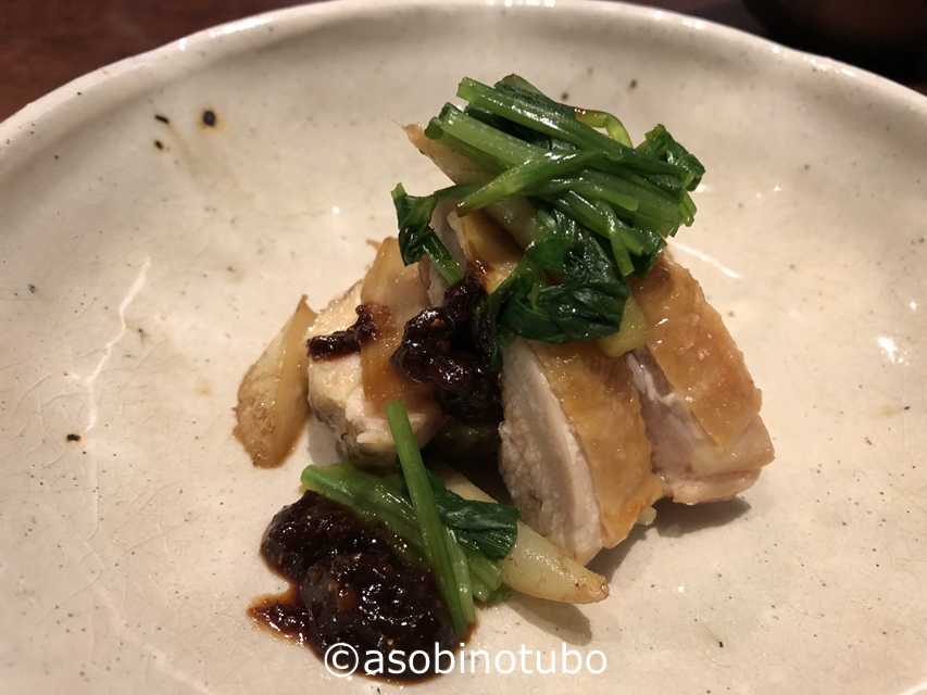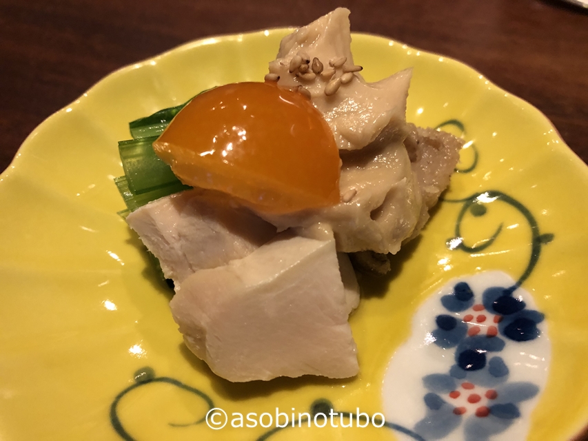 蒸し鶏です。蓮根と小松菜を濃厚なゴマダレで頂きました。乗っかっている赤いのは金柑かな。