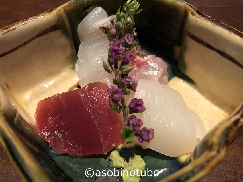 刺身です。赤いのは鰹。コウイカと鯛です。