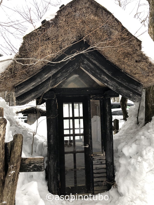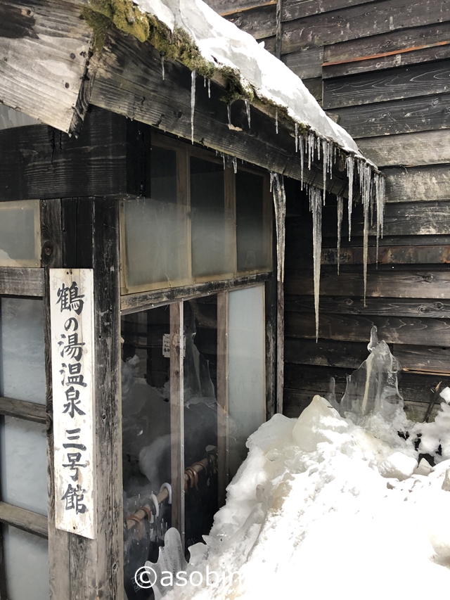 入り口のバス待ち小屋でしょうか。鶴の湯の案内が書かれていました。